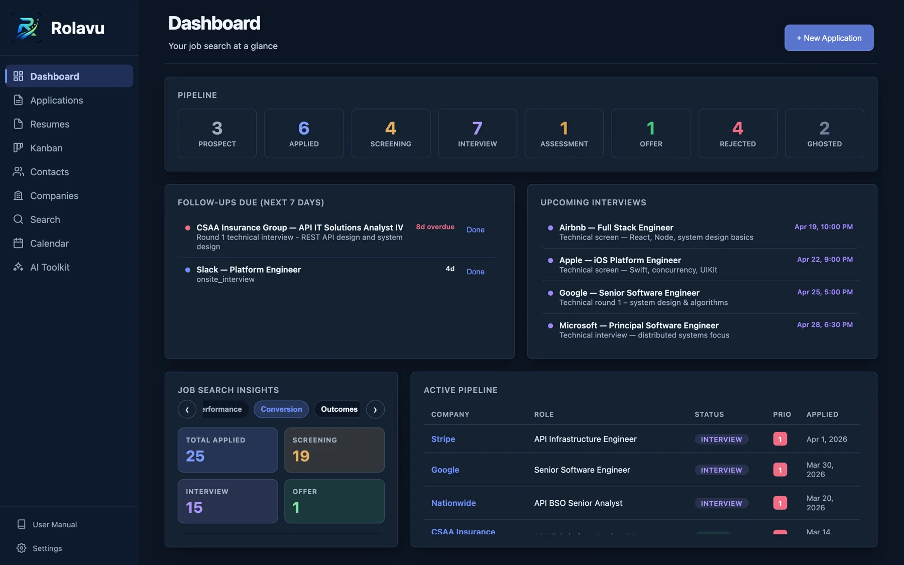 The dashboard brings your pipeline, overdue follow-ups, interviews, and job-search insights together so you know where to focus next.